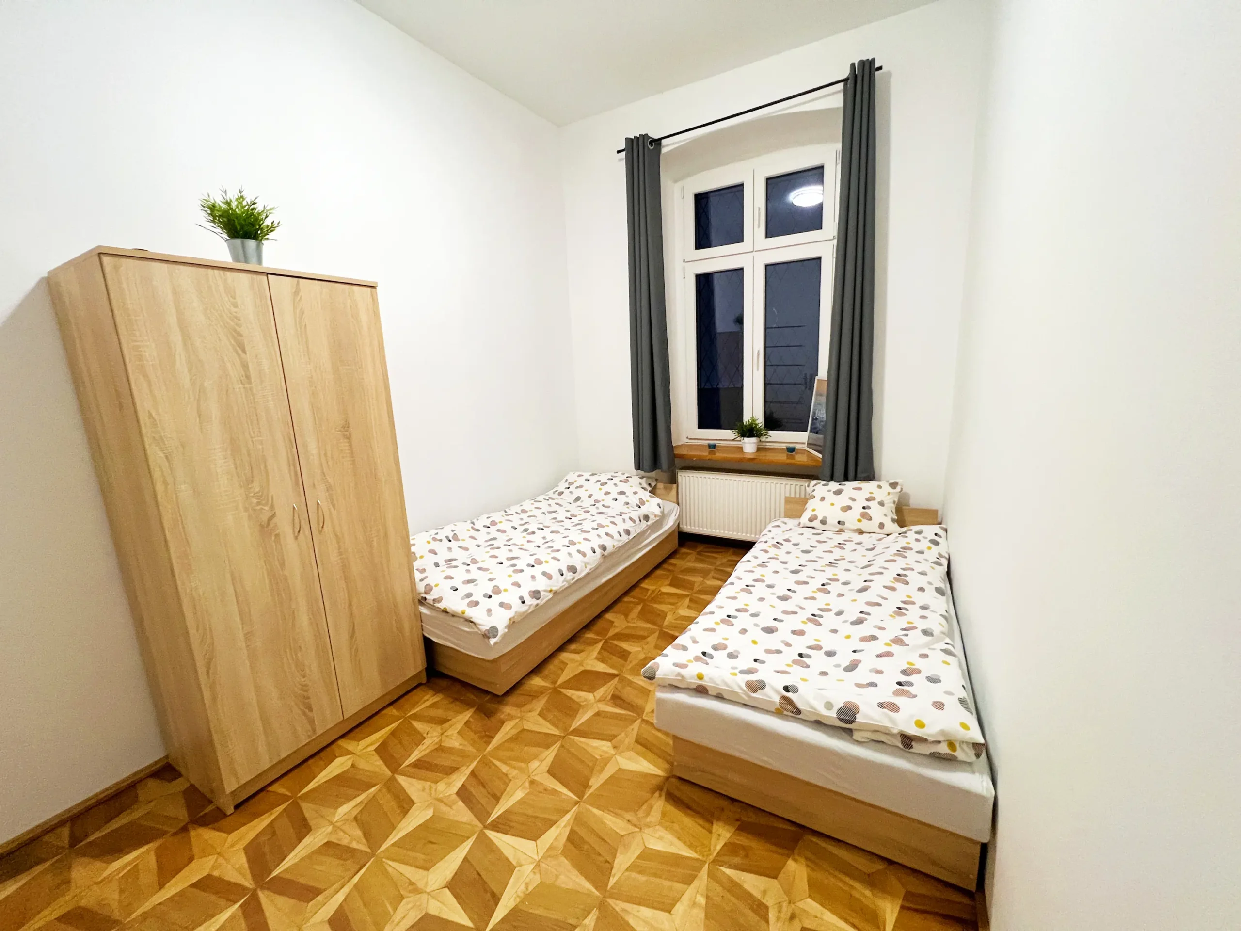 Komfortowy pokój wyposażony w szybki internet światłowodowy Wi-Fi oraz Smart TV z dostępem do Netflixa i YouTube. Do dyspozycji są wygodne łóżka, funkcjonalne meble oraz prywatna lub współdzielona łazienka. Goście mogą korzystać z w pełni wyposażonej kuchni i pralni, a bezpieczeństwo zapewnia monitoring obiektu.